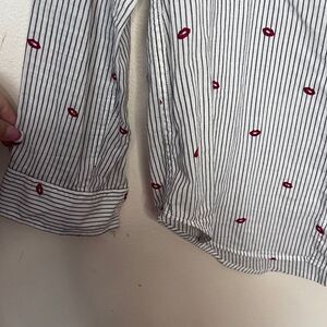 Kissy lips add a feminine touch to this sleek striped shirt.