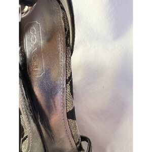 Elevate your style with these chic Coach wedge sandals. The iconic signature 'C' print on the fabric vamp is beautifully complemented by glossy black patent leather straps that artfully crisscross and tie, creating a flattering silhouette. The natural cork wedge heel adds a touch of earthy sophistication and provides comfortable height. Perfect for a stylish brunch, a summer wedding, or a sophisticated evening out.excellent pre owned condition only one minor fade where foot rest as pictured