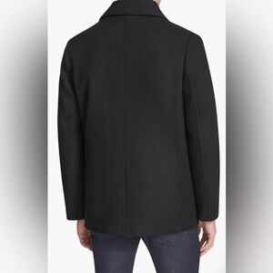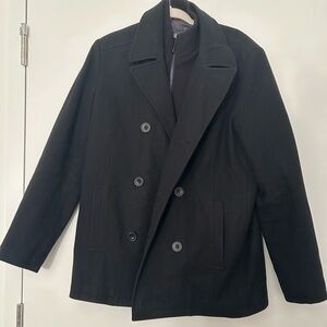 Classic black peacoat with a double-breasted front. Perfect for stylish warmth.