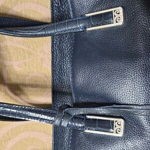 Soft pebbled leather w/ croc embossed trim, top handles, removable/adjustable crossbody strap, zip top