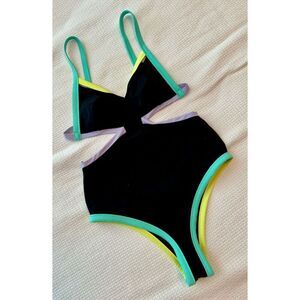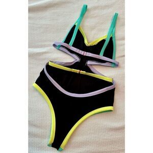 Victoria’s Secret black and neon outline cutout one piece swimsuit. Has an open back and sides. Lined and has adjustable back straps