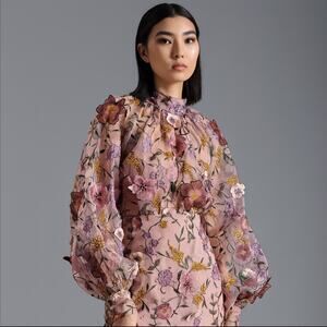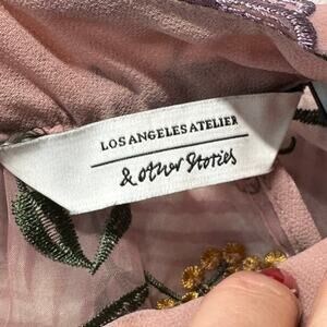 Elevate your wardrobe with this stunning & OTHER STORIES Los Angeles Atelier $279 voluminous floral sheer organza 3D blouse. Crafted from a dusty pink fabric and adorned with intricate floral embroidery in pink, yellow, purple, and green, this top is both feminine and elegant. It features a high neckline, long sleeves with button cuffs, and a romantic sheer overlay, perfect for layering over a camisole.
