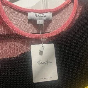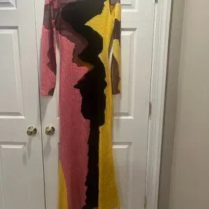 Hanifa dress size L in the color pink hues. NWT and tall girl friendly. Short queens should wear with heels. For reference, I'm 5'4'' and tried this on with 4" heels without issue. *Please note, there is a small pull in the knit that is pictured above. The fabric is very delicate so be very careful when taking on and off.