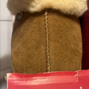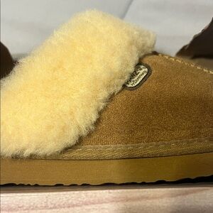 Cozy BearPaw Women’s suede slippers with plush lining. Brown/Tan and cream lining. Stain resistant and self cleaning material. Size 6. New in box