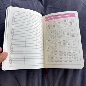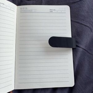 Sleek black folio notebook. This notebook has it all - a cardholder pouch, reference pages containing things like metric conversions and international dialing numbers for convenience, and a secure strap.