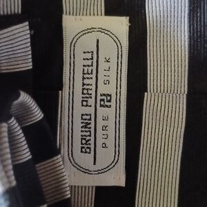 This awesome Bruno Piattelli 'pure silk' necktie is silver and black striped. 100% imported silk. Classic, contemporary, stylish, timeless. In good, gently-used condition.