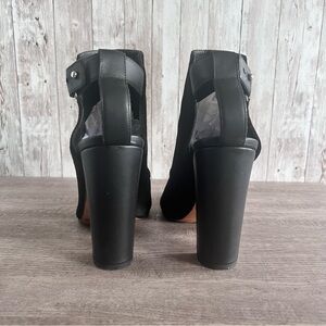 Lightly worn condition. Black suede peep toe boot with ankle buckle for adjusting the width around the ankle. Size 8.
