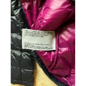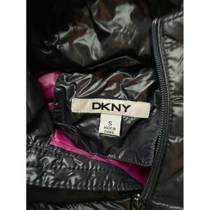 Sleek DKNY puffer jacket in classic black. Features horizontal quilting, full-zip front closure, attached hood, and side pockets. Lightweight yet warm design perfect for layering. Ideal for casual outings, daily commutes, or travel thanks to its packable nature. Pink interior lining adds a stylish touch. In excellent condition with no visible flaws.