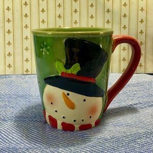 Festive mug featuring a snowman design. Green background with a red handle. Ideal for holiday beverages.