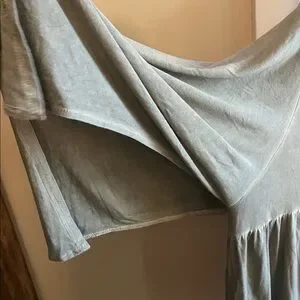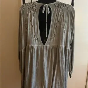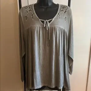 Beautiful boho fall top in a warm gray with leaf embroidery and open back, buttery soft, unique sleeves that are open on the bottom. Labeled a Medium but oversized at approx 26” PTP so listed as XL