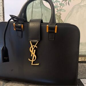 Sleek black leather strap. Features gold-tone hardware. Perfect for handbags.
