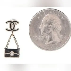 Add a statement of timeless Parisian chic to your jewelry box with these authentic Chanel Others Line earrings! These stunning post-back earrings feature the iconic interlocking CC logo at the top and an adorable black enamel quilted handbag charm dangling from a fine gold chain, complete with a tiny pearl accent for a touch of elegance.