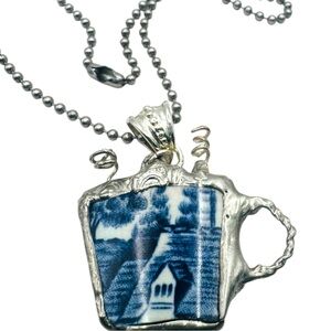 Once, a cherished blue willow tea cup graced elegant tables; now, reborn into a sterling silver pendant, it carries whispers of timeless tales and tea.