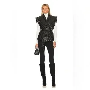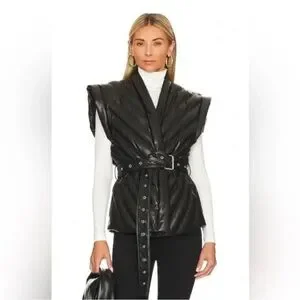 Sleek black quilted vest with a stylish belt. Perfect for layering. Adds a modern touch to any outfit.