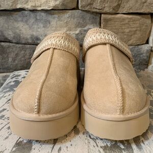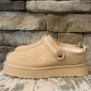 Sold out online. Chic suede slippers with a beige finish. Features a comfy platform sole and woven strap detail. Ideal for everyday wear.