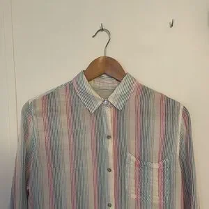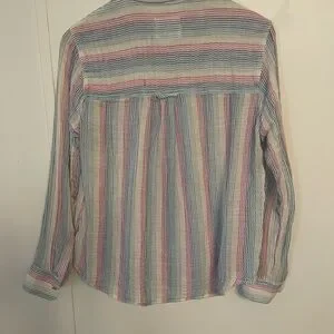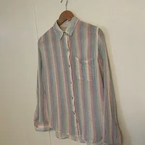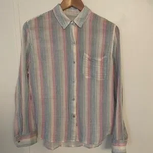 Chic and versatile button-down with multicolor stripes. Ideal for casual wear. Lightweight Cotton. True to size fit.