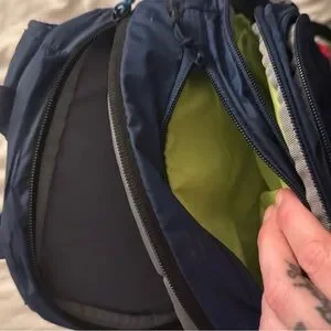 Sleek CamelBak backpack in navy and crimson. Ideal for outdoor adventures.