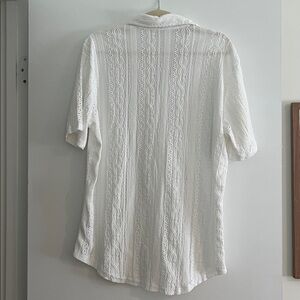 Stylish white button down with textured design. Short sleeves for a relaxed fit. Ideal for casual outings. Size M. Consider bundling this item with 2 additional items for a bundle discount. I'd be glad to build you a special bundle listing of 3+ items on a Closet Clear Out day so you can receive the $4.99 discounted shipping offer from Poshmark. Thank you for viewing and reading. Happy Poshing!