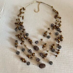 This statement set contains multi layer necklace and dangle earrings. Super cute coper color faceted glass beads with gunmetal color beads and clear rhinestones set on wire and lobster clasp. The earring are pieced dangle earrings. Nice high quality set with good weight to it. No signature tag.