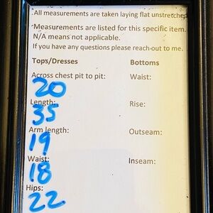 Pit to pit 20", length 35", arm length 19", waist 18", hips 22"