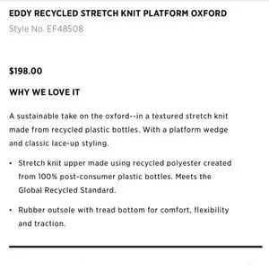 Amazing shoes from Eileen Fisher, women’s size 10. Poly knit upper, almond toe, lace up closure, platform wedge rubber sole. Only very light wear, bottom soles are like new. Excellent condition!