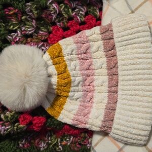 Warm hat with faux fur inside and rabbit feel for pom pom is O/S by Marcus Adler.