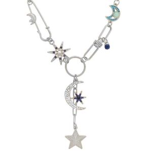 Embrace celestial elegance with this stunning gold necklace featuring blue and silver charms. Perfect for adding a touch of sparkle to any outfit.