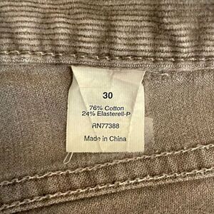 J. Crew toothpick cord. Size 30. Excellent condition. Cool ankle zippers, garment dyed for extra softness, perfect stretch fit. Cocoa/ mushroomy/ taupey grey color.