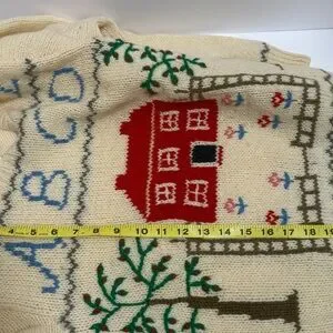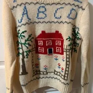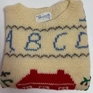 Elegant cream Vintage 100% wool sweater by Deans of Scotland. Features a cozy knit design with schoolhouse theme. In excellent pre-worn condition.