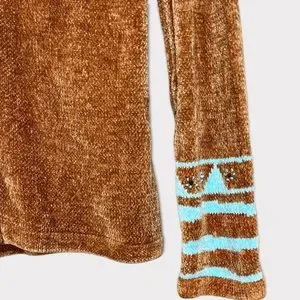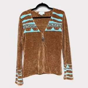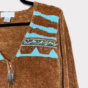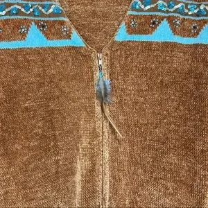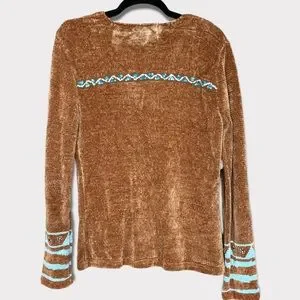 Stylish brown sweater with blue tribal accents. Soft fabric. Long sleeves. Perfect for casual wear.