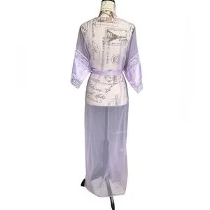 Shannon Lee Vintage lavender see through nylon robe with wide half ribbon and lace sleeves. Satin ribbon belt.