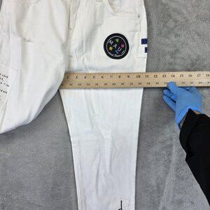 Style: Womens limited edition white denim jeans featuring Maui and Sons themed graphics, including shark and logo patches with printed text details.