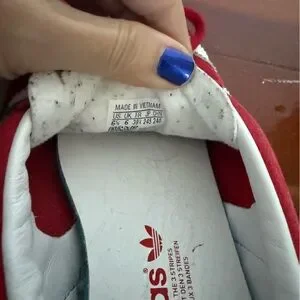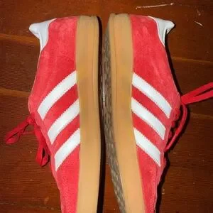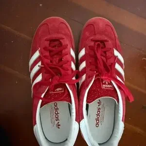 Adidas Gazelle Indoor in scarlet cloud white . Women’s 7.5. Men’s 6.5 only worn a few times. suede upper with a gum rubber outsole