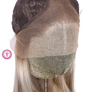 Light warm blonde with light brunette lowlights and shadow root with a Scandinavian hairline