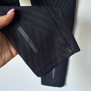 Black leggings with a bold chevron design. Ideal for active or casual wear.