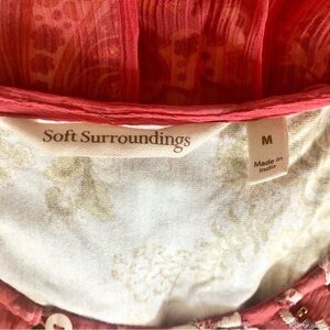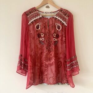 Gorgeous Soft Surroundings Beaded Embroidered red orange top with three quarter sleeves. Top has a patterned lunging with sheer overlay. Neckline has a button closure with keyhole feature.