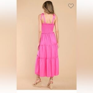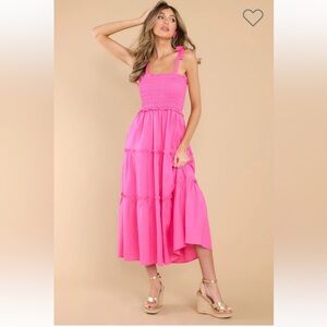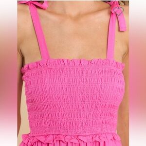 This dress features a square neckline, adjustable self-tie shoulder straps, smock design throughout the bust, and a flowy tiered skirt. Model is wearing a small. • 55% Linen, 45% Viscose • Hand Wash Cold • Lined 100% Rayon • Imported