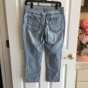 New without tags. Eddie Bauer brand women’s cropped jeans in size 6. Beautiful cream colored embroidery on front pockets, two working back pockets as well. Front zipper and metal button closure. Inseam length of 25 1/2”. Showing photos of front and back sides along with fiber contents and care information.
