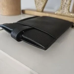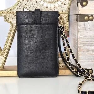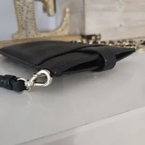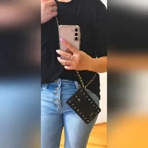 Elegant black wristlet with studded design. Features a chain strap. Perfect for evening outings.
