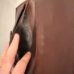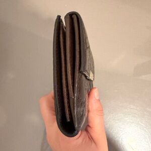 Luxurious Gucci wallet in dark brown leather. Features signature embossed pattern and gold-tone accent.