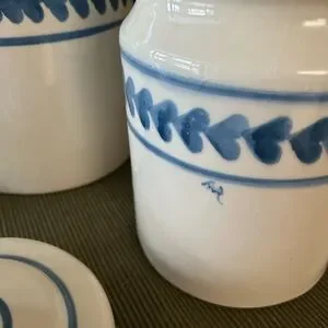 Lovely Hartstone vintage pottery canister set-made in USA. Excellent condition with hand painted heart design initialed by artist. Sizes as shown in pics.