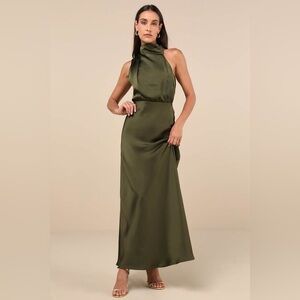 LULU’S Distinctive Charm Olive Green Satin Asymmetrical Maxi Dress