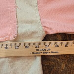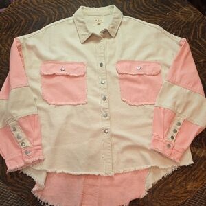 POL Cream and Pink Denim BOHO Patchwork Button Up Oversized Raw Edge Top