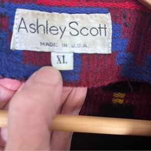 Vintage Ashley Scott Woven Blanket Cardigan Swester Coat, Coatigan. Colorful southwestern, Aztec, Indian print, shawl collar, pockets. Oversized. Made in USA.