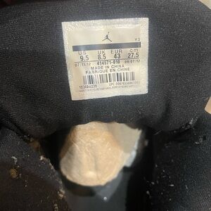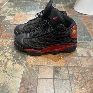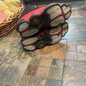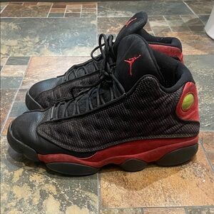 Classic Jordan Retro 13 design. Black upper with red accents. Iconic style and comfort. Left Sole separation.