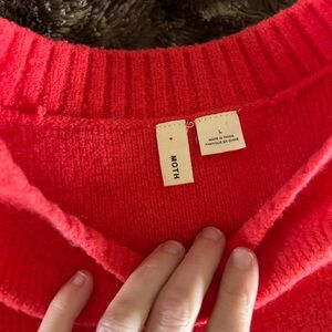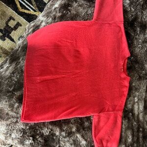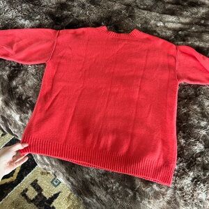Bright coral sweater with a relaxed fit. Features a classic crew neck and three-quarter sleeves. Ideal for casual wear.
