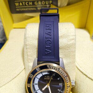 Bad-assery abound with this bad boy on your wrist... nice navy blue silicone strap with this heavy gold and silver accented sleek watch from Invicta Specialty Collection. Case and Dial
