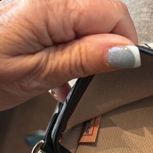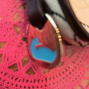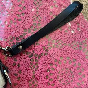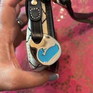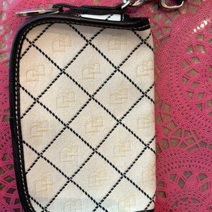 Elegant cream clutch with black accents. Features a wristlet strap. Iconic Dooney & Bourke design.