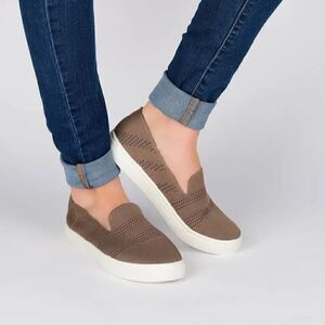 Step into comfort and style with these Journee Collection Meika Slip-On Sneakers. Designed with a breathable knit fabric upper and a lightweight cushioned sole, these slip-ons are perfect for everyday wear. The sleek taupe/brown neutral shade pairs effortlessly with jeans, leggings, or casual dresses, making them a must-have staple for your wardrobe.