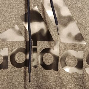 Comfortable gray and navy hoodie with Adidas logo. Features a cozy interior and sustainable materials. Non smoking home. No holes, no stains. Great condition.